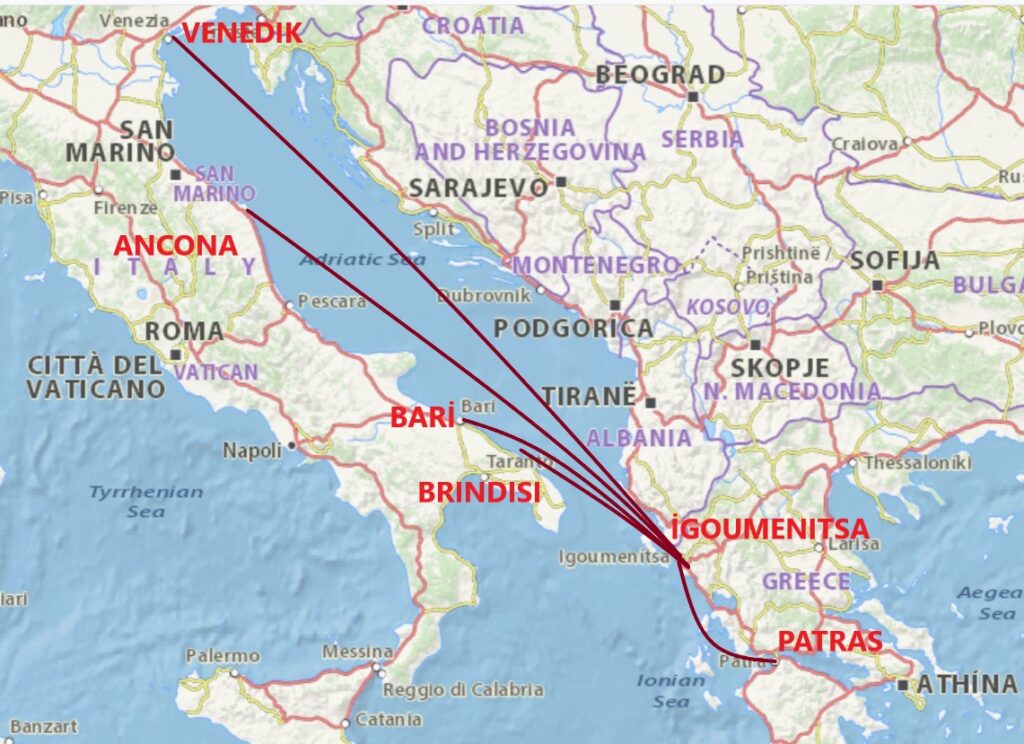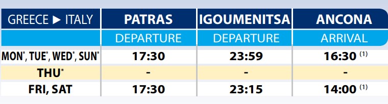 Her ne kadar herkes Feribota İgoumenitsa dan biniyorsa da ,gemiler Patras tan kalkıyor.Örneğin gece 23:30 da İgoumenitsa dan Ancona ya kalkan feribotların ilk kalkış yeri Patras ve burdan 17:30 gibi hareket ediyorlar.