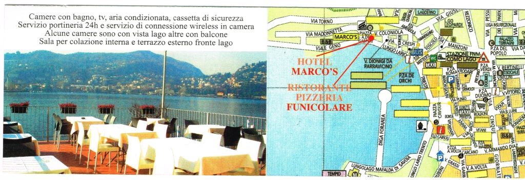 İtalyanın en kuzeyinde ,İsviçre sınırına bitişik,Como gölü kıyısında, merkeze yürüme mesafesinde ,terasının harika göl manzarası olan bir küçük otel.Süper bir ristorante/pizzareia leri var.Pizzayı sipariş ettiğimizde garson, abi bunda domuz var istersen şundan al bunda domuz yok deyince garsonun ve otel sahibinin Türk olduğunu öğrendik.Nerdeyse İtalya da yediğimiz en güzel pizza yı da burda yedik ki ustası da vatandaşımızmış.Sahibi ile yemekten sonra kendi imal ettikleri limonçello eşliğinde sohbet ederken Como gölü civarında 2000 civarında Türk aile olduğunu ve hepsinin turizm sektöründe başarı ile çalıştıklarını şaşırarak öğreniyoruz.Bu aileler eskilerde İsviçre ye geçme amacıyla buralara gelmişler,ama sınırı geçemeyince Como ya yerleşmişler, iyide yapmışlar.Severek kaldık ,gene kalmayı isteriz.