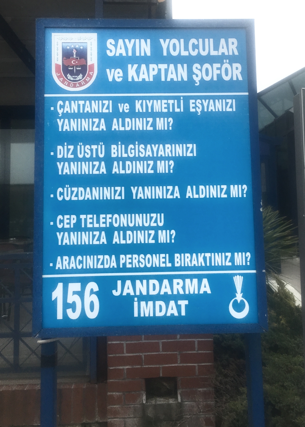 Bu tabelayı geçen pazartesi (26 şubat 2018) ) Balıkesir ,Susurluk Varan dinlenme tesislerinde gördük.Başka yeremi gitsek yoksa tesise birer birer gidip birimiz aradamı beklesek diye epey düşündükten sonra ya herru ya merru deyip arabann kapılarını kilitleyip tesise girdik.Sayın Varan grubu .Zaten bütün tesisleri tasfiye ettiniz elinizde bir bu kaldı.bir güvenlikte mi tutamıyorsunuz.