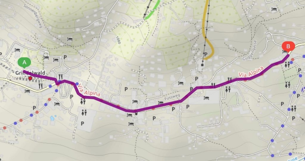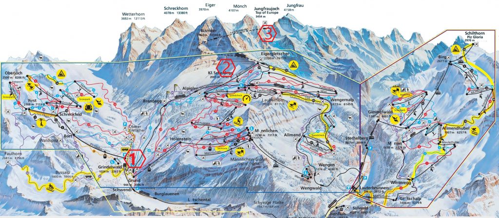Yukardaki haritada gördüğünüz gibi Jungfrau tepesine trenle çıkış iki aşamada.Grindenwald istasyonu 1034 m rakımında.Burdan ilk trenle Kleine Scheidegg (rakım 2061 mt) alanına geliniyor.Burda oteller ,restaurantlar ve dükkanlar var.