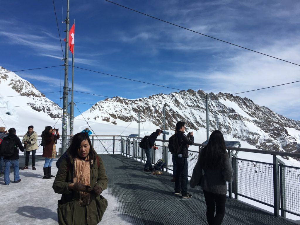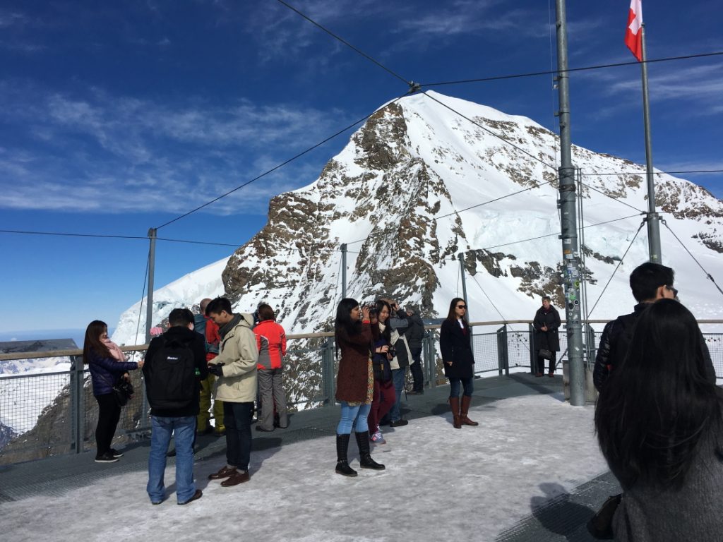 İstasyonda trenden indikten sonra ilk farkettiğimiz havadaki oksijen yokluğu oluyor.Ağzınızı açıp balık gibi dolaşmaya başlıyorsunuz.Genç yaşlı farketmiyor yürümek bile zor.Çevreyi biraz dolaşıp dükkandan hatıra anahtar vs alıyoruz ve adet üzeri 3454 mt resimlerimizi çekiyoruz.Üç adet restaurant var ama biri sadece Çinli gruplara ayrılmış.Ama bu havasızlıkta bir şey yiyecek içecek hal yok.Bir an önce kendimizi trene atalım ,ara istasyonda (Kl.Scheidegg ) de yemeyi planladık.