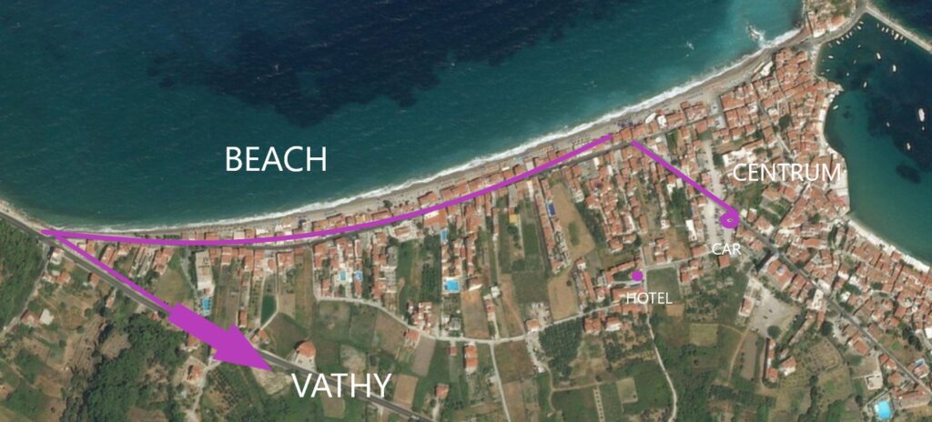 Yola çıkıp 10 km sonra Vathy e geliyoruz.Yolumuz Vathy nin çevresinden dolaşıp Pisagora gidiyor ama biz ana yoldan ayrılıp Vathy merkeze gitmek için deniz doğru iniyor 10 dk sonra limana gelirken bir park yeri bulup aracımızı park ediyoruz.