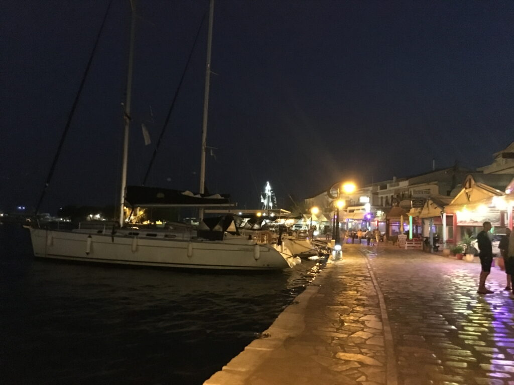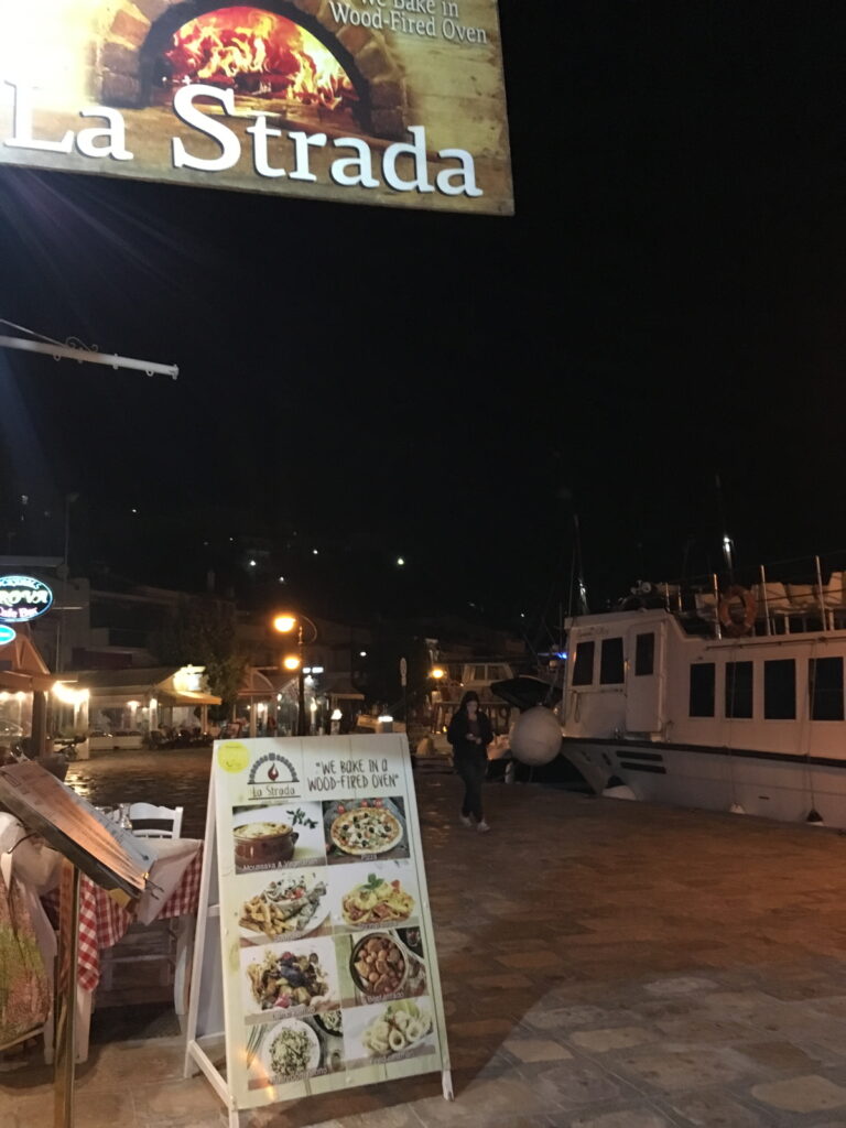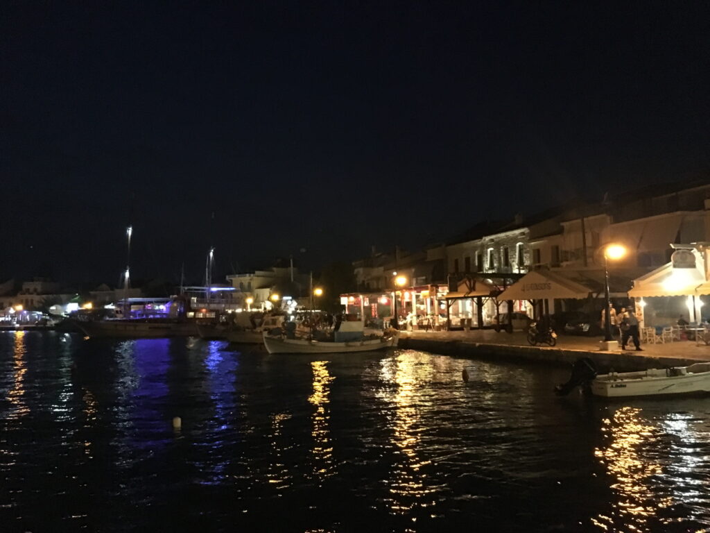 Yemek için geç kaldık ama bu bizim için.Yunan adalarında akşam 8 de yemeğe giderseniz ve tavernayı ,restaurantı bomboş görürseniz şaşırmayın.Yunanlı komşularımız genellike akşam yemeğine 9 ile 10 arasında giderler ve yemekten gece 12 gibi kalkarlar.Bu yemeği ne zaman hazmedeler bizim için bir muamma.