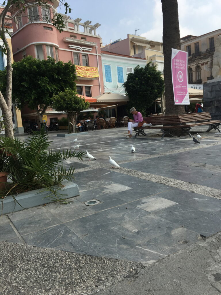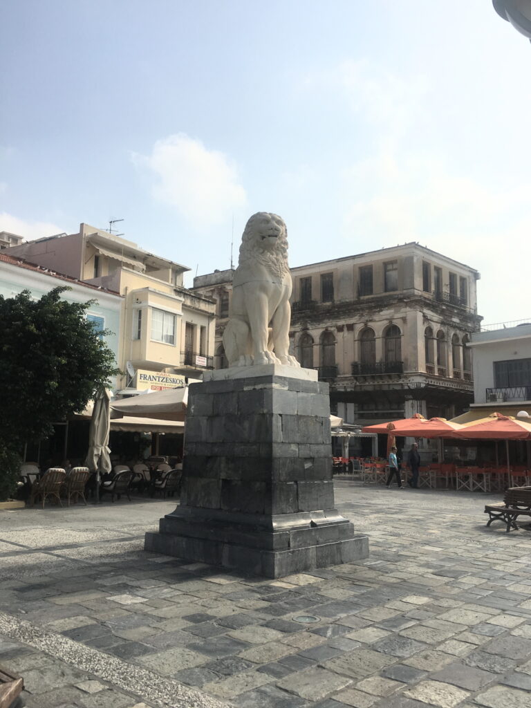 Vathy nin merkezi olarak bir Aslanlı Meydanı (Pythagoras Square at the centre of Vathy’s harbour promenade, is locally known as Lion Square after the statue which was erected here in 1930 to commemorate the Greek War of Independence