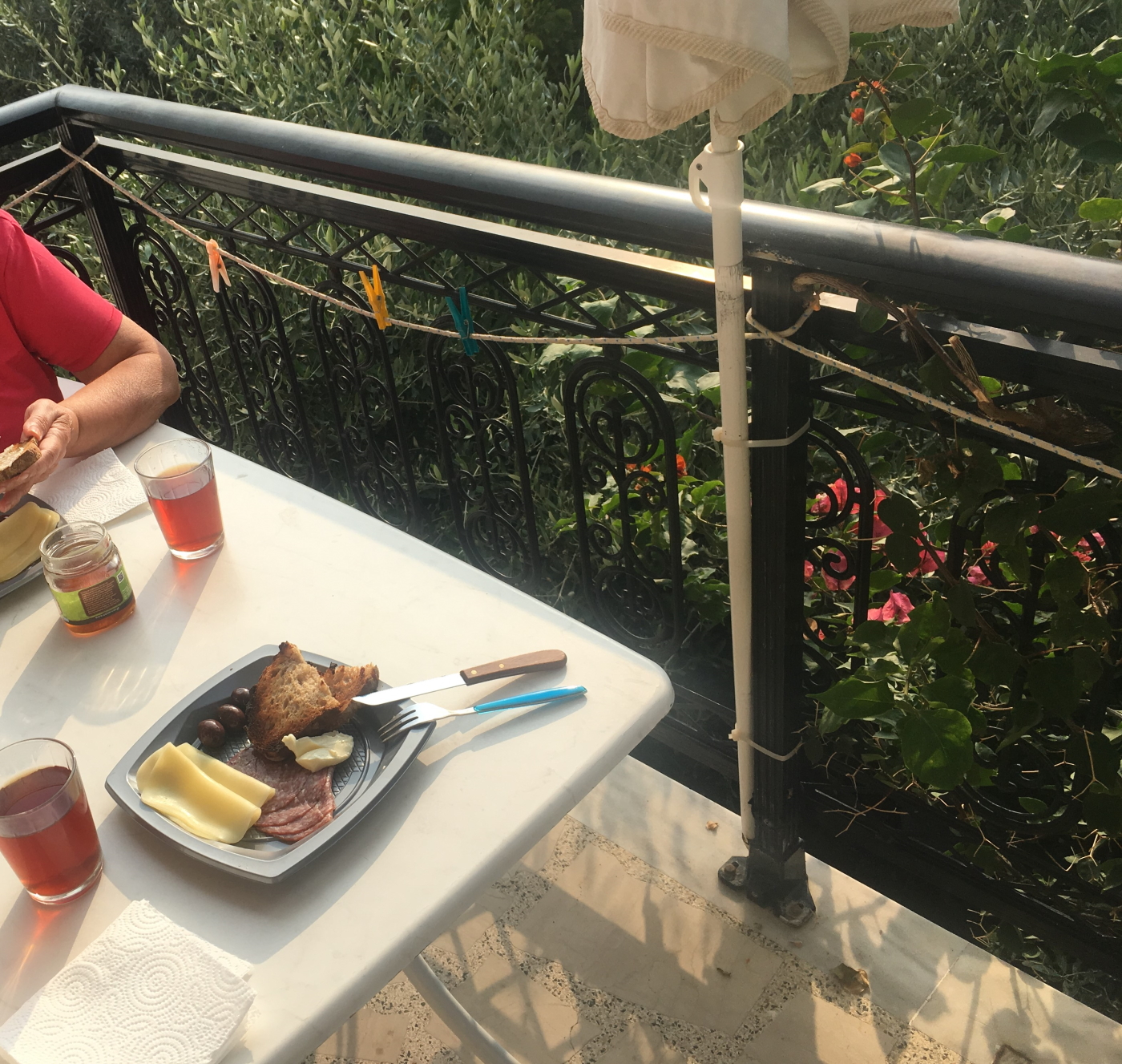 Evet sabah odamızın minşk balkonunda kahvaltımızı ediyoruz.Önümüzde bu kadar güzel mis gibi kokulu bahçe ve şahane hava varken balkon kimin umurunda.