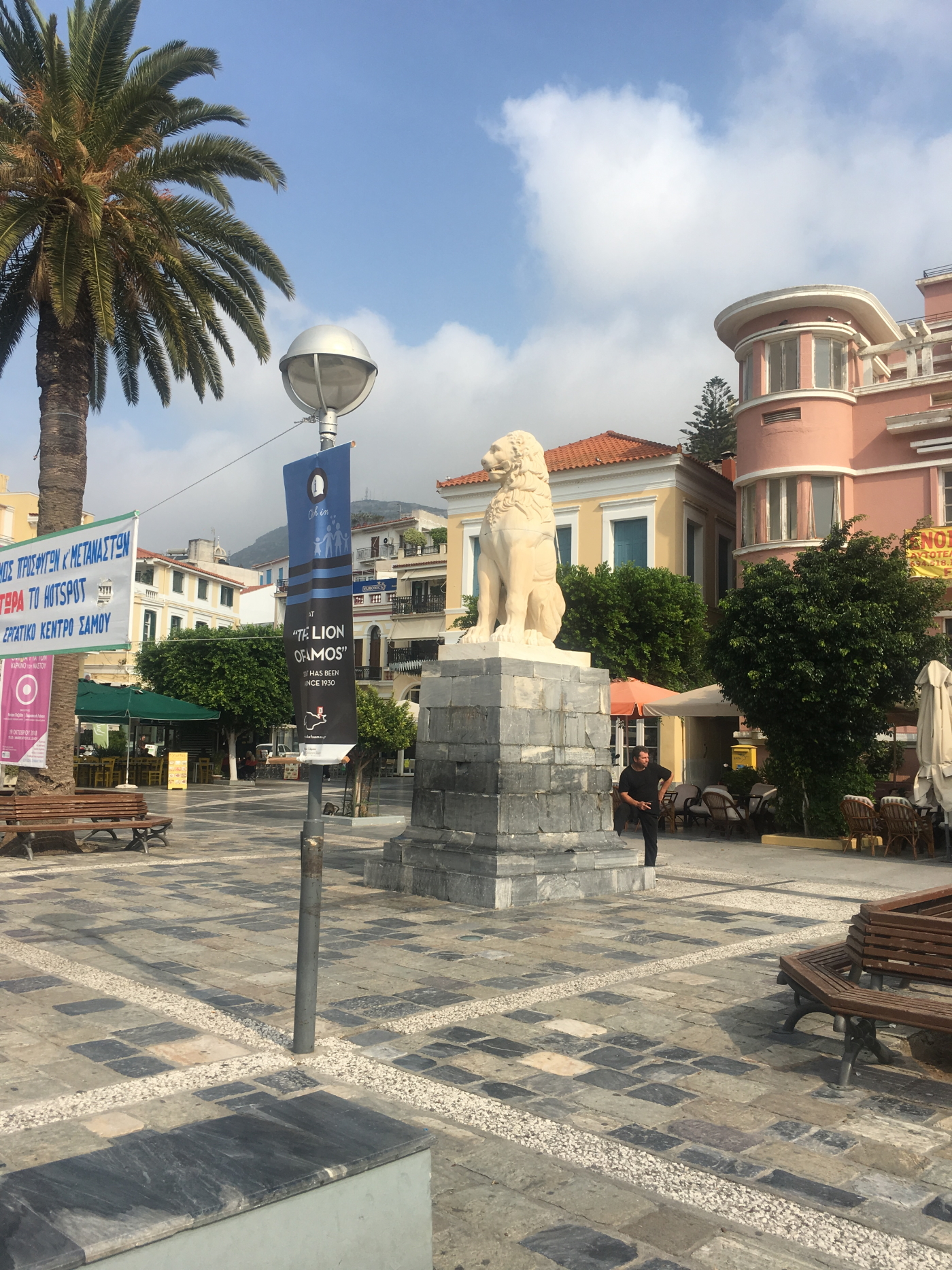 Vathy nin merkezi olarak bir Aslanlı Meydanı (Pythagoras Square at the centre of Vathy’s harbour promenade, is locally known as Lion Square after the statue which was erected here in 1930 to commemorate the Greek War of Independence