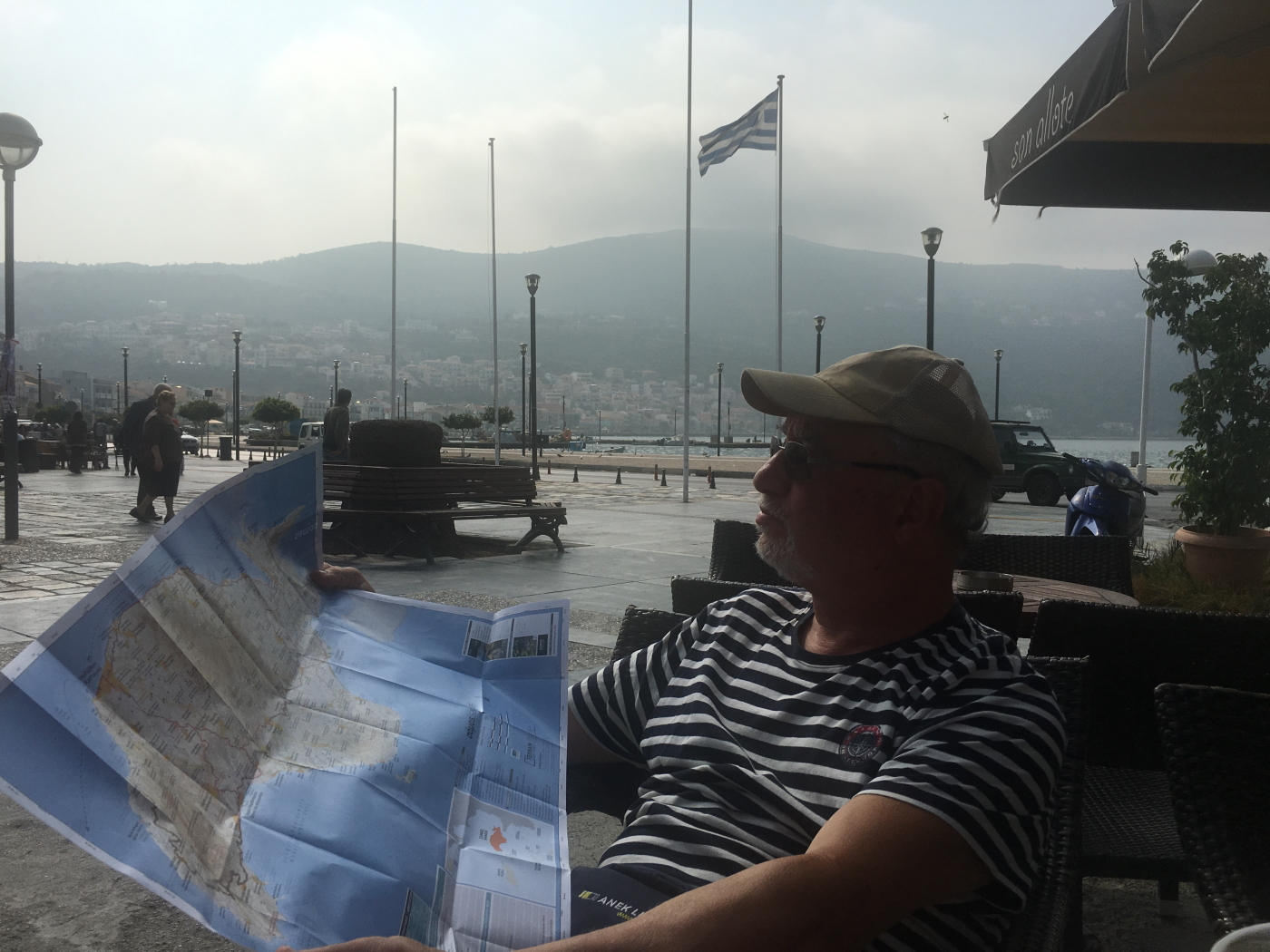 Samos adasında Kokkariyi tanıma amaçlı bir gece kaldık.Bu günkü planımız adanın güney kıyısındaki Pisagor kasabasına gitmek.orda biraz daha uzun kalacağız.Yolumuz 22 km ve Samos un merkezi Vathy den geçtiği içiin önce orda bir mola verip dolaşalım,sonra yoldaki Lidl marketten alışveriş yapalım diyoruz.